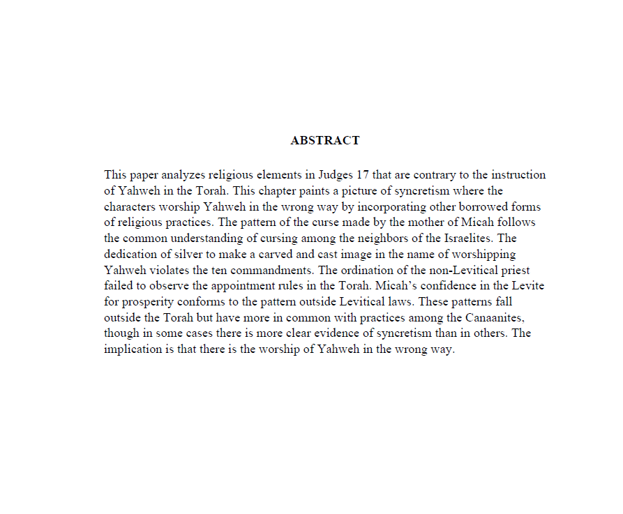 This paper analyzes religious elements in Judges 17 that are contrary to the instruction of Yahweh in the Torah. This chapter paints a picture of syncretism where the characters worship Yahweh in the wrong way by incorporating other borrowed forms of religious practices. The pattern of the curse made by the mother of Micah follows the common understanding of cursing among the neighbors of the Israelites. The dedication of silver to make a carved and cast image in the name of worshipping Yahweh violates the ten commandments. The ordination of the non-Levitical priest failed to observe the appointment rules in the Torah. Micah’s confidence in the Levite for prosperity conforms to the pattern outside Levitical laws. These patterns fall outside the Torah but have more in common with practices among the Canaanites, though in some cases there is more clear evidence of syncretism than in others. The implication is that there is the worship of Yahweh in the wrong way.
